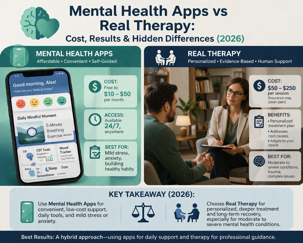 Mental Health Apps vs Real Therapy: Cost, Results & Hidden Differences (2026)